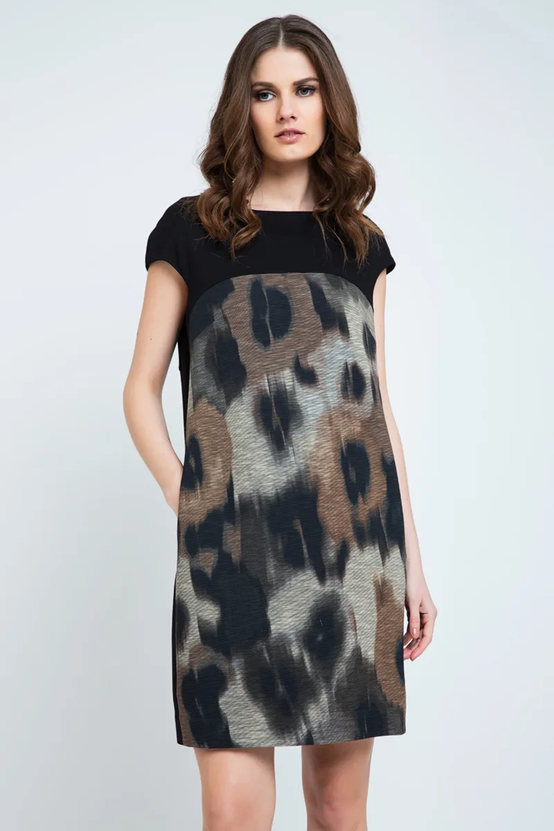 Abstracte Print Jurk met Zakken van Conquista Fashion in stretchstof. Ons model is 176 cm lang en draagt maat 36/S. Gemaakt in Griekenland.