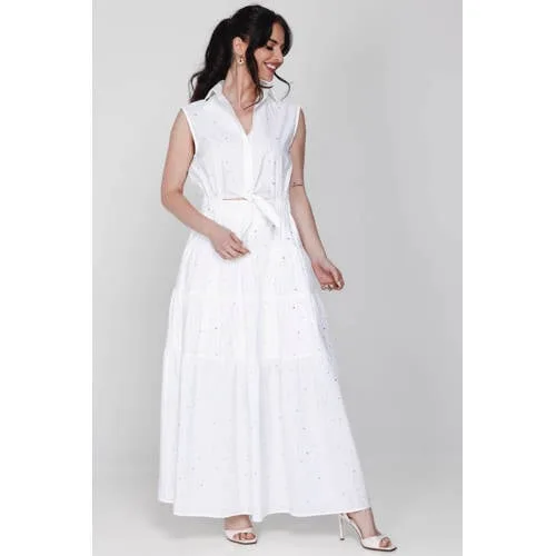 De Accentil Robin Dress jurk in ecru is een lange maxi jurk die direct opvalt door de rustige kleur en subtiele details. De V-hals zorgt voor een open uitstraling, terwijl de mouwloze afwerking het ontwerp luchtig en licht maakt. Ideaal voor warme dagen of een speciale gelegenheid in het voorjaar of de zomer.Verfijnde details en draaggemak Gemaakt van katoen, dat zacht aanvoelt op de huid en prettig draagt gedurende de dag. Maxi lengte met een A-lijn pasvorm voor een vloeiende, licht uitwaaierende look. Effen ecru kleur, makkelijk te combineren met verschillende schoenen en accessoires. Plooien in de stof geven extra beweging en een speels resultaat bij elke stap. Strass steentjes zorgen voor een subtiele glans, passend bij zowel feestelijke als nette momenten. Elastische inzet in de taille voor een comfortabele pasvorm die mooi aansluit zonder te knellen. Geen zakken, waardoor de lijn van de jurk volledig tot zijn recht komt.Van zomerdag tot avondfeestDeze lange glitterjurk in A-lijn model is geschikt voor uiteenlopende momenten, van een ontspannen zomerdag tot een meer formele gelegenheid in de avond. De ecru kleur en subtiele glans van de strass steentjes zorgen voor een verzorgde uitstraling die past bij verschillende settings.Accentil als stijlvolle basis in je garderobeAccentil ontwerpt kleding die modieuze details combineert met draagbaar comfort. Door te kiezen voor tijdloze kleuren en doordachte pasvormen, sluit het merk aan bij een moderne levensstijl waarin je kleding zowel praktisch als stijlvol mag zijn.Een lichte, lange jurk die comfort en een verzorgde uitstraling op een toegankelijke manier samenbrengt.