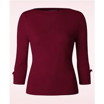 Elegant en schattig deze 50s Addicted Sweater in Burgundy van Banned! Eenvoudig maar toch speciaal door de lieflijke details! De top heeft een mooie slash halslijn en flatterende 3/4 mouwtjes met splitjes die afgezet zijn met kleine vaste strikjes, só cute! Uitgevoerd in een heerlijke soepele, stretchy bordeauxrode viscosemix die zijn perfecte pasvorm zal blijven behouden, zelfs na een aantal wasbeurten. Een veelzijdige classy top die niet mag ontbreken in de kast van iedere vintage lady, de naam zegt al genoeg; wij zijn addicted! * ‘Slash’ hals * 3/4 mouwen met strikjes * Lang genoeg om op een normale heupbroek te dragen