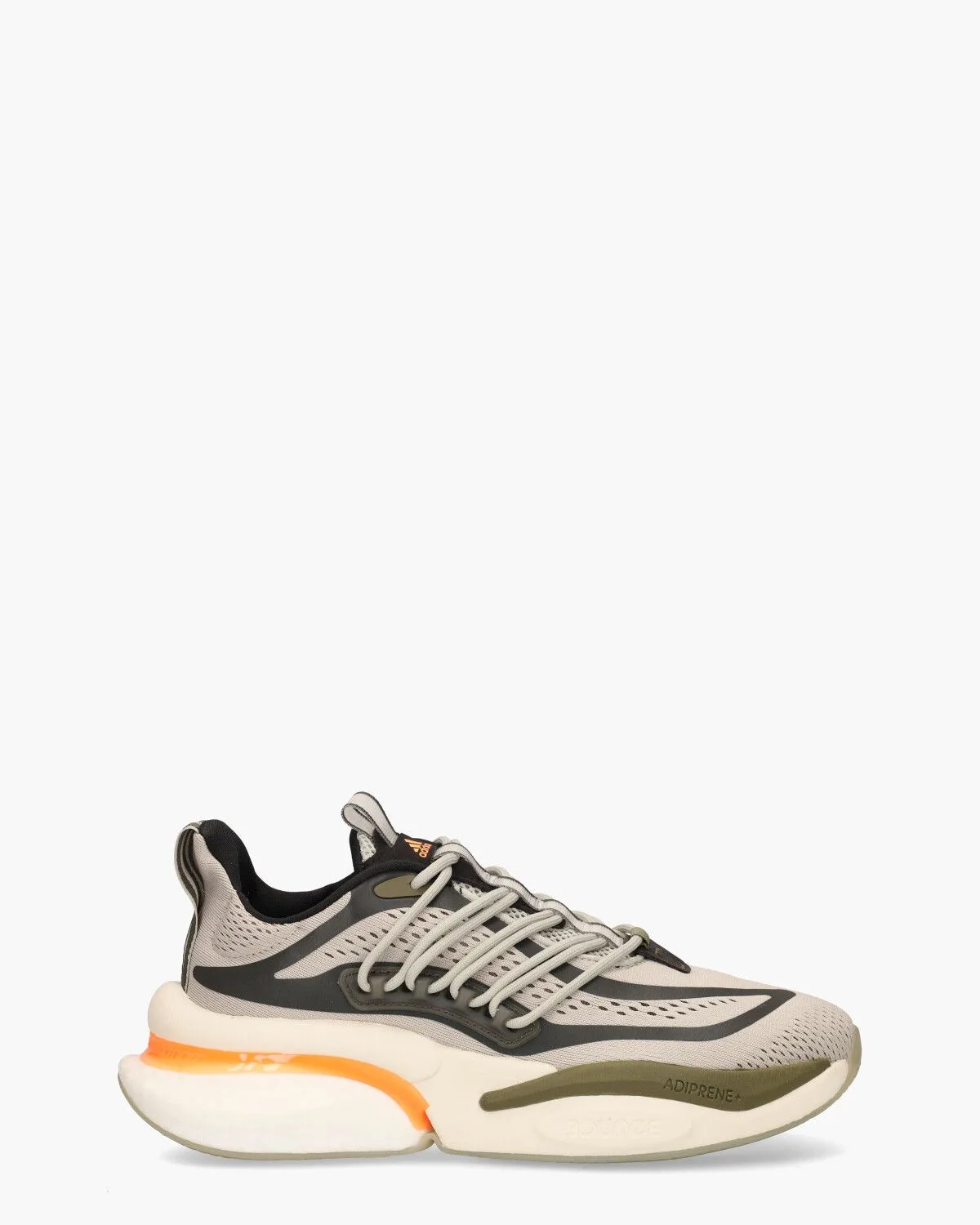Sneakers voor heren Alphaboost V1 HP2763 uit de collectie van Adidas. Deze sportshoe heeft een upper van mesh gedeeltelijk gemaakt van gerecycled materiaal in grijs, zwart en groen. De binnenkant is in synthetische stof uitgevoerd en is voorzien van een uitneembaar voetbed. De chunky multicolor rubberen Adiwear-loopzool is bouncy en loopt daardoor heel comfortabel. Adidas branding op de tong, grijze veters en oranje details maken het geheel compleet. Kleur: multi. (Metal Grey/Screaming Orange/Olive Strata)