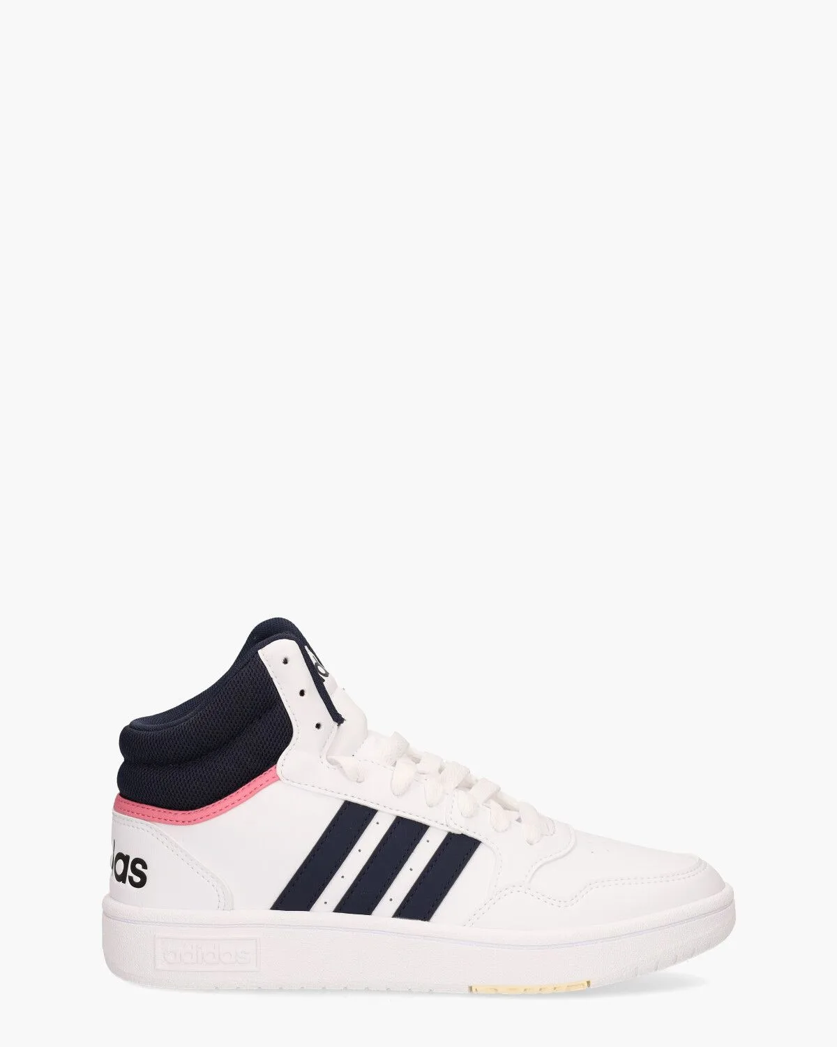Hi-top sneakers voor dames Hoops 3.0 Mid GW5455 uit de Adidas Originals collectie. Deze sneaks in retro basketbalstijl hebben een upper van wit synthetisch leer. De binnenzijde met vast EVA-voetbed is in stof uitgevoerd. Het enkelstuk is gemaakt van padded donkerblauw mesh afgewerkt met een roze band. De kenmerkende donkerblauwe 3-stripes en
