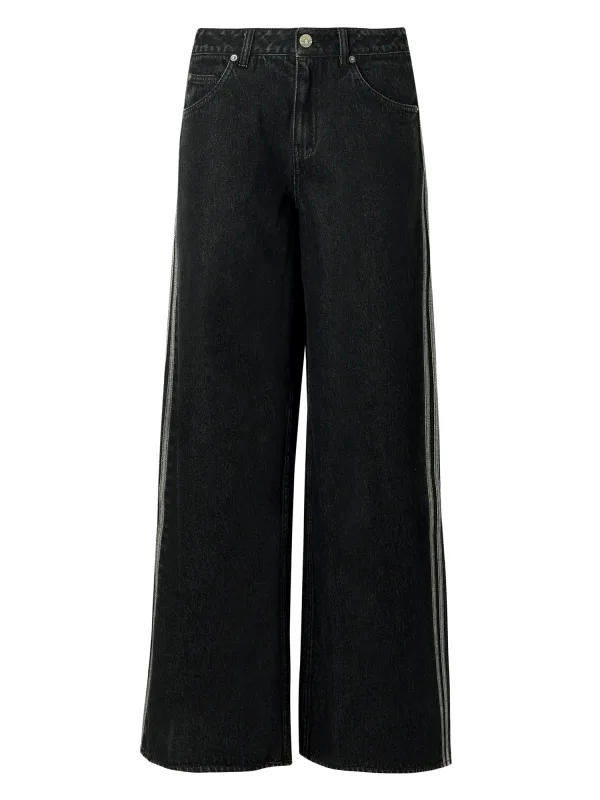 Design: Gevoerde zoom/rand, Ritssluiting, 5-pocket-style, Knop sluiting; Type sluiting: Ritssluiting; Materiaal: Denim; Motief: Logoprint; Details: Zijstrepen; Extra's: Studs, Op staal naden, Gewassen effect, Vaste grip, Riemlussen; Wassing: Rinsed/dark washed; Lengte: Lang/maxi; Pasvorm: Baggy; Taillehoogte: Mid waist