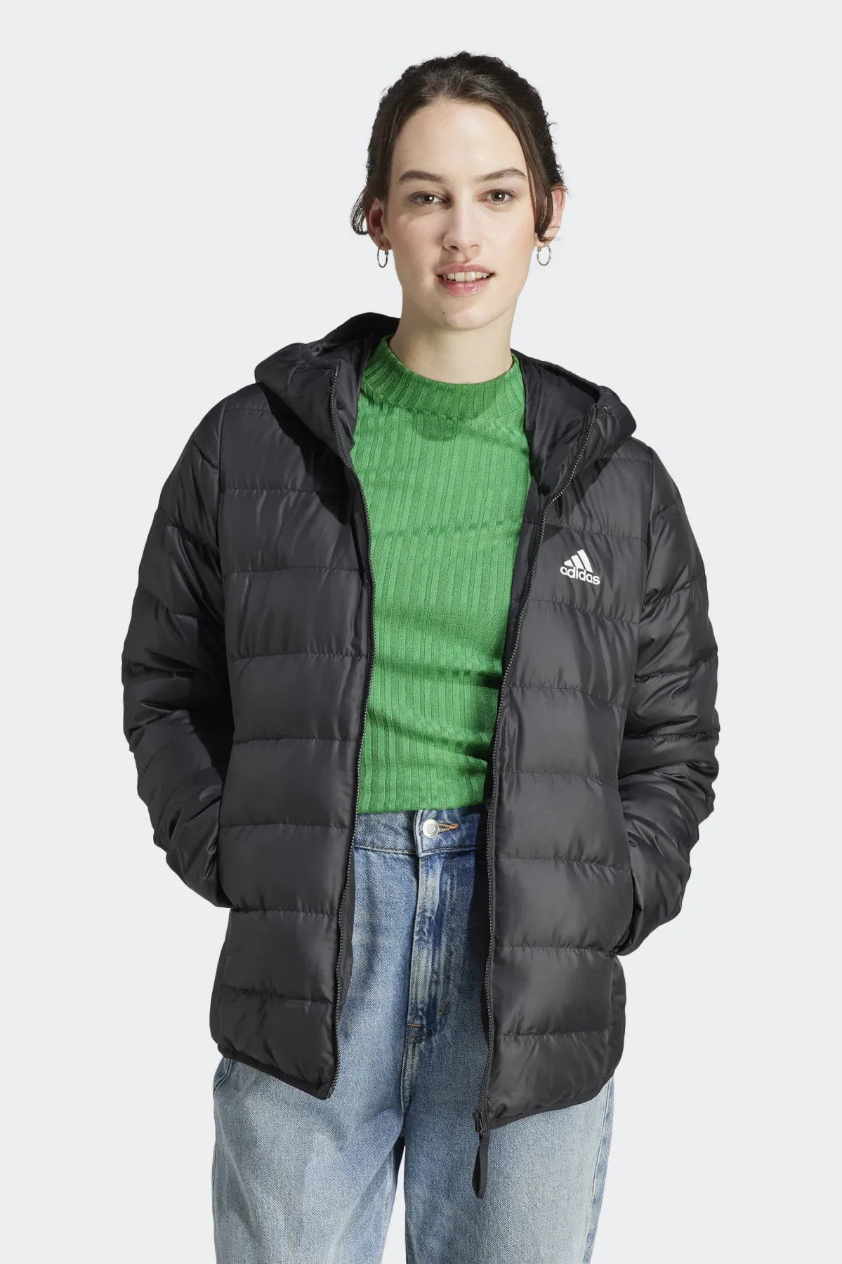 Dit discrete adidas jack past gemakkelijk bij elke outfit en beschermt je tegen de kou. Hij is gewatteerd met dons en veren om je warm te houden zonder je te belasten. De PFC-vrije waterafstotende coating beschermt je tegen de regen, terwijl de capuchon met elastisch trekkoord hem op zijn plaats houdt als de wind opsteekt. Stop je telefoon en sleutels in de zakken en je bent klaar voor avontuur. Dit product is gemaakt van gerecycled materiaal en bevat 70% minimum gerecycled materiaal. Het is slechts een van onze oplossingen in de strijd tegen plastic afval.