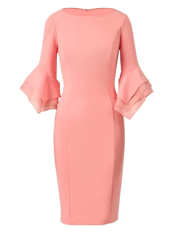 Design: Rug rits, Trompetmouwen; Type sluiting: Ritssluiting; Materiaal: Crêpe; Halstype: Boothals; Motief: Effen; Details: Volant; Extra's: Op staal naden; Lengte: Knielengte; Pasvorm: Slanke pasvorm; Armlengte: Driekwart mouw