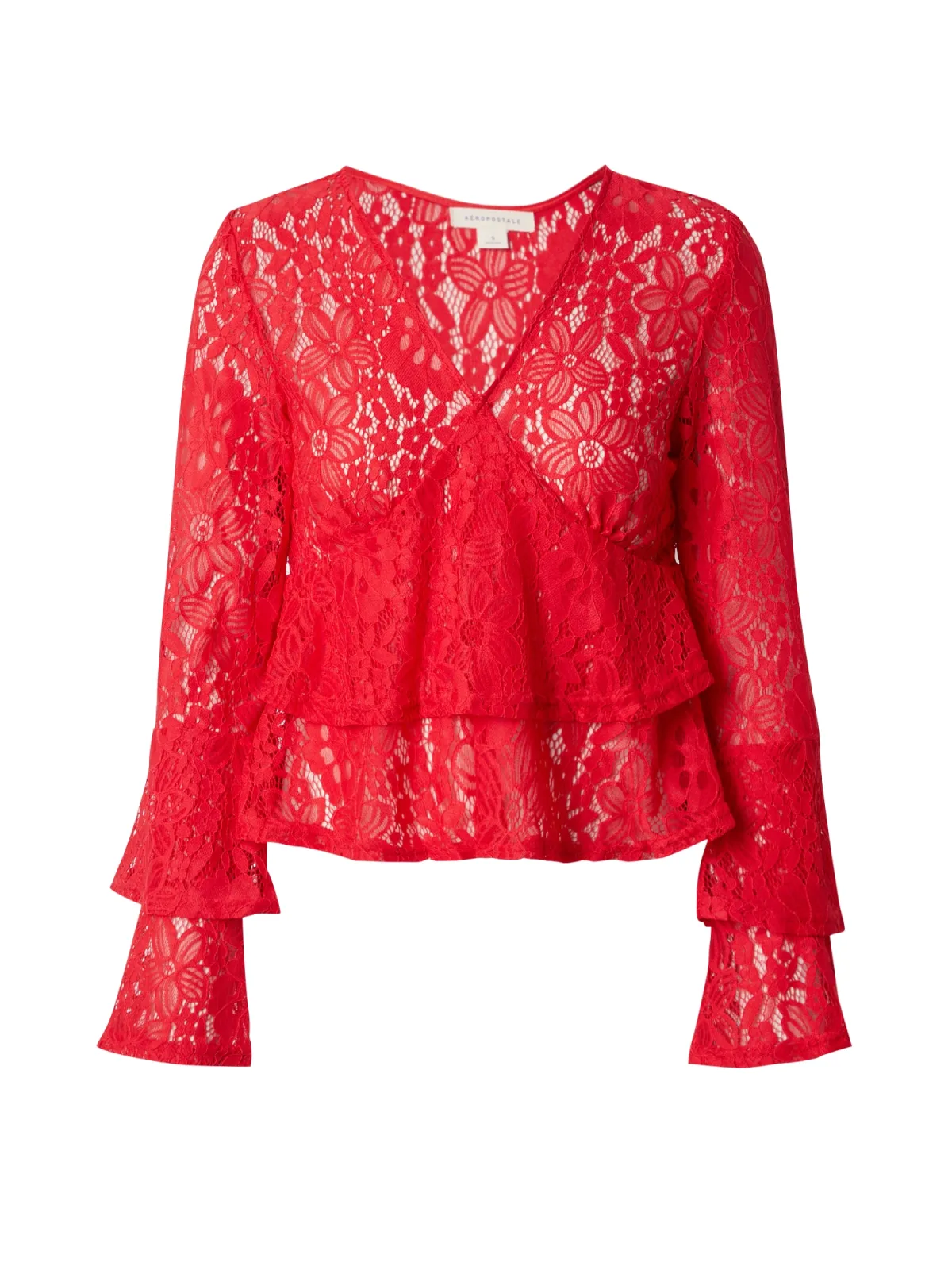 Blouse type: Blouseshirt; Design: Diepe snit/decolleté, Trompetmouwen; Motief: Effen; Kraag: Zonder kraag; Details: Volant, Gedrapeerd; Extra's: Licht transparant, Op staal naden; Pasvorm: Normale pasvorm; Armlengte: Lange mouw; Lengte: Normale lengte