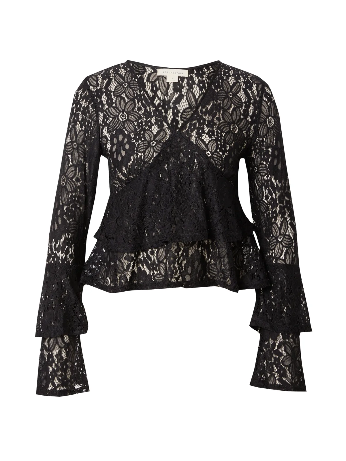 Blouse type: Blouseshirt; Design: Gevoerde zoom/rand, Flare; Motief: Effen; Kraag: Zonder kraag; Details: Volant, Gedrapeerd; Extra's: Transparant, Op staal naden; Pasvorm: Normale pasvorm; Armlengte: Lange mouw; Lengte: Normale lengte