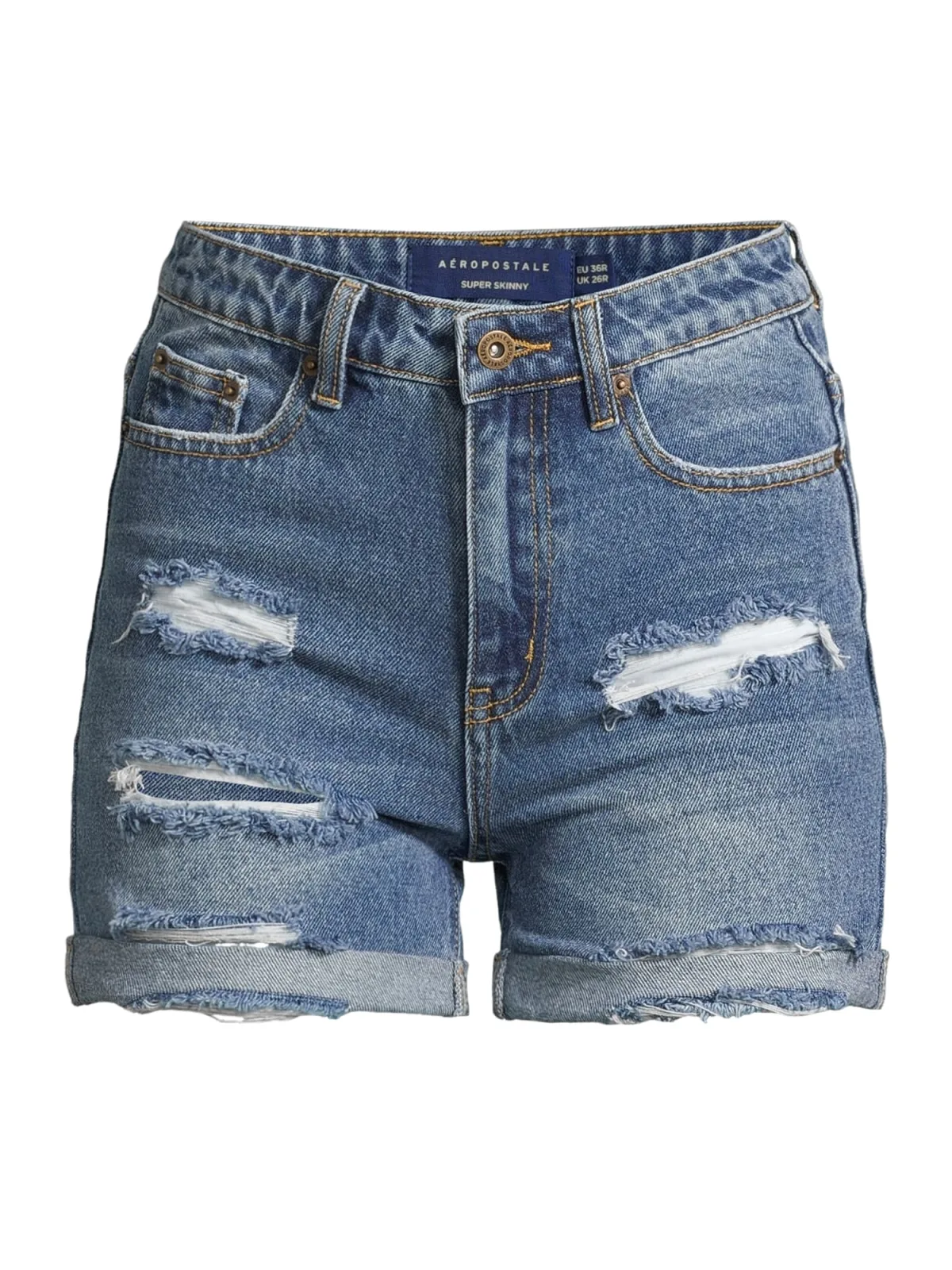 Design: Omgeslagen zoom, Ritssluiting, 5-pocket-style; Type sluiting: Ritssluiting; Materiaal: Denim; Motief: Effen; Details: Cut-outs; Extra's: Studs, Contrasterende naden, Label patch/label flag, Used-look, Gewassen effect, Riemlussen; Wassing: ripped; Lengte: Kort/mini; Pasvorm: Regular; Taillehoogte: High waist