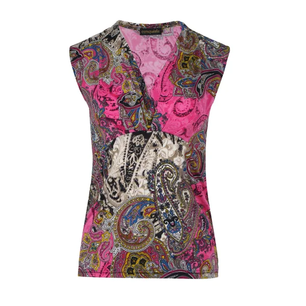 CONQUISTA top van stretchstof. Mouwloos met een imitatiewikkeleffect aan de voorkant voor een diepe V-hals. Naad onder de buste.