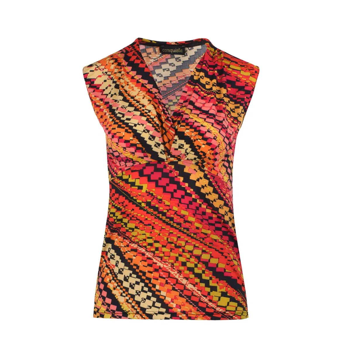 CONQUISTA top van stretchstof. Mouwloos met een imitatiewikkeleffect aan de voorkant voor een diepe V-hals. Naad onder de buste.