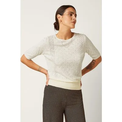 “Love at first knit.” Deze Agnes Marea top in crème heeft ons hartje meteen weten te veroveren! Ze heeft een ronde halslijn, korte mouwen en is uitgevoerd in een zachte, soepele en fijngebreide katoen-viscosemix die heerlijk draagt. * Ronde halslijn * Korte mouwen * Stretchy ribboorden * Lang genoeg om op een normale heupbroek te dragen