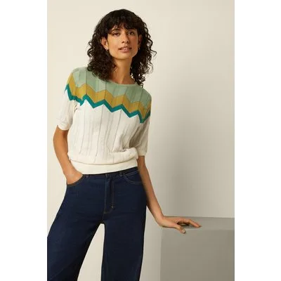 ''She's simple and effective!’ Dit schatje is een echte must-have voor het komende seizoen! Agnes is uitgevoerd in een fijngebreide, zachte, soepele en stretchy bio-katoenmix, voorzien van een fantastisch retro zigzagpatroon en een subtiele ingewerkte gouden glitterdraad. * Ronde halslijn * Korte mouwen * Stretchy ribboorden * Lang genoeg om op een normale heupbroek te dragen