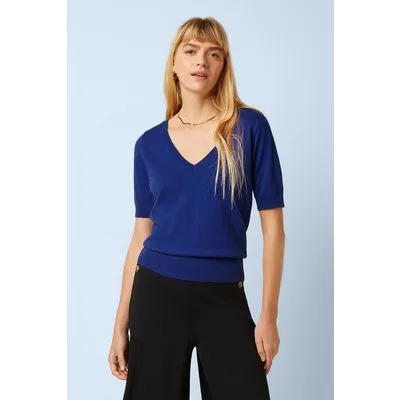 Deze beauty is een echte must-have voor het komende seizoen! Agnes is uitgevoerd in een fijn gebreide, soepele en stretchy, donkerblauwe katoenmix met een vleugje zijde. * V-hals * Korte mouwen * Lang genoeg om op een normale heupbroek te dragen