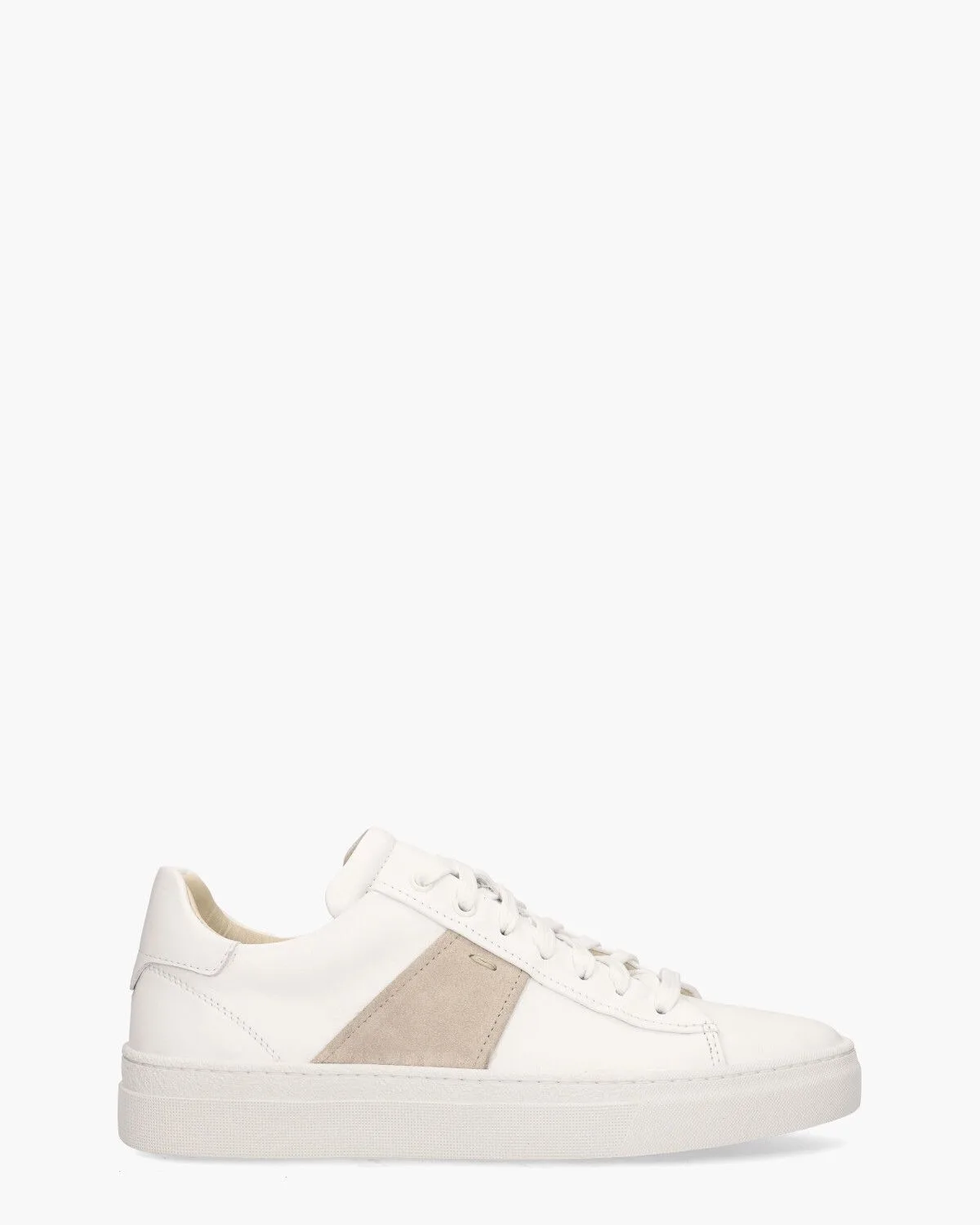 Sneakers voor heren Teun uit de collectie van Daniel Kenneth. Dit model in oldskool tennisstijl heeft een bovenzijde van wit leer. Het taupekleurige accent opzij zorgt voor een contrasterende look. De gewatteerde tong en het hielstuk, samen met de witte rubberen zool, geven je comfort bij elke stap. De sneaks zijn voorzien van een lederen