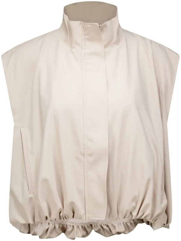 Bodywarmer Lowen van Aimée the label heeft een casual, minimalistisch ontwerp in effen beige. De opstaande kraag met rits sluit hoog, de regular pasvorm valt ruim zonder mouwen. Zakken op de voorzijde geven gemak. De elastische zoom zorgt voor vorm. Combineer met een vest en jeans.
