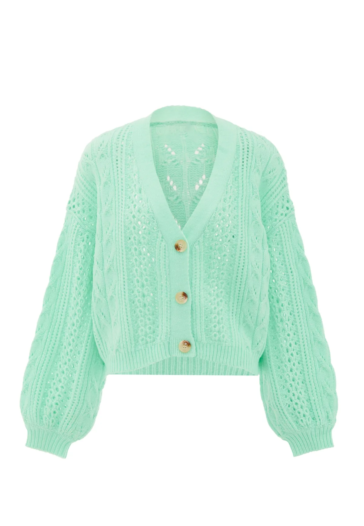 Design: Geribd ceintuurtje; Type sluiting: Knoopsluiting; Halstype: V-hals; Motief: Effen; Details: Mesh; Extra's: Voelt zacht aan; Pasvorm: Normale pasvorm; Armlengte: Lange mouw; Lengte: Korte pasvorm