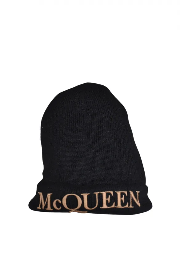 Zwarte Alexander McQueen kasjmier muts.Beige McQueen centrale inscriptie op voorzijde.Made in Italy.