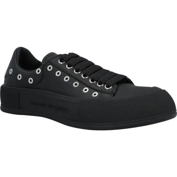 Zwarte nappa leren veter Deck Plimsoll met zilverkleurige oogjes en een dikke, oversized rubberen zool. De veterschoen is voorzien van een rubberen wikkelozool en een tonale Alexander McQueen-handtekening. Ronde teenvorm gesilhouetteerd met een rubberen teenkap. Wordt geleverd met een extra set zwarte veters. Materiaal: 100% Kalfsleer Maten: