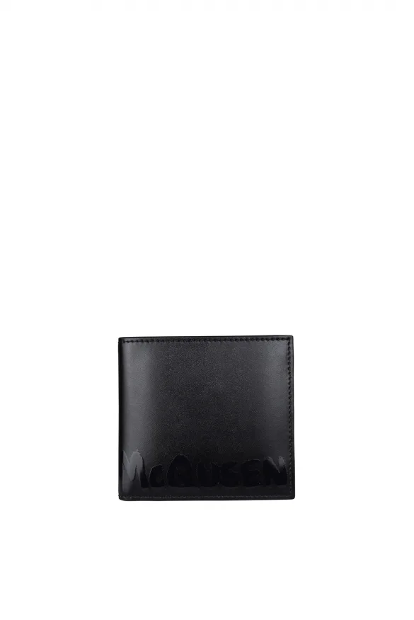 Alexander Mcqueen-portemonnee van glad zwart leer.Contrasterend kenmerkend logo op de voorkant.Gleuven voor creditcards en een centraal vak.Afmetingen: 11 cm x 10 cm.100% leer.Gemaakt in Italië.