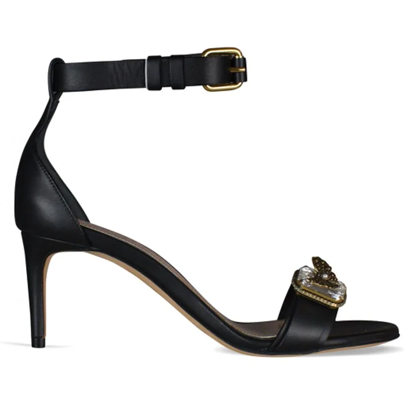 Sandalen van Alexander McQueen.Zwart leer.Band aan de voorkant versierd met een gouden juweel.Gespriem bij de enkel.Gouden afwerkingen.Afgeronde neus.Hakhoogte 6 cm.Made in Italy.