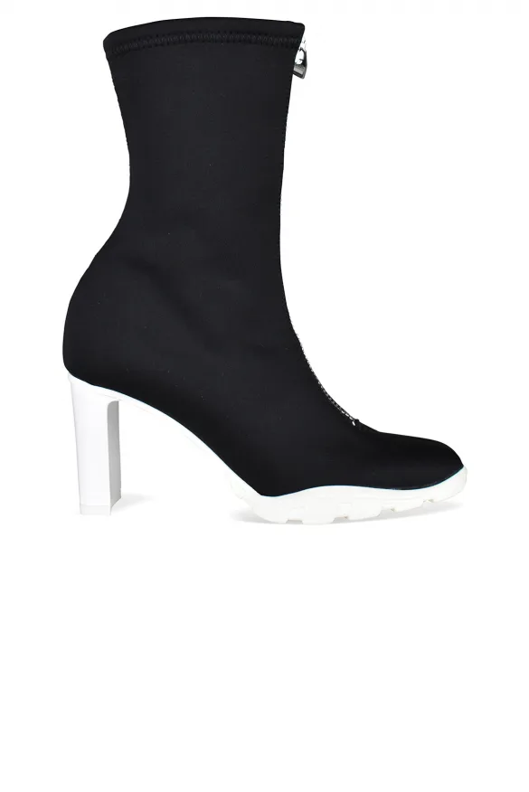 Scuba 85 mm Alexander McQueen zwarte canvas laarzen.Ritssluiting aan de voorkant.Hoge hak.Amandelvormige neus.Contrasterende witte rubberen zool.Gemaakt in Italië.