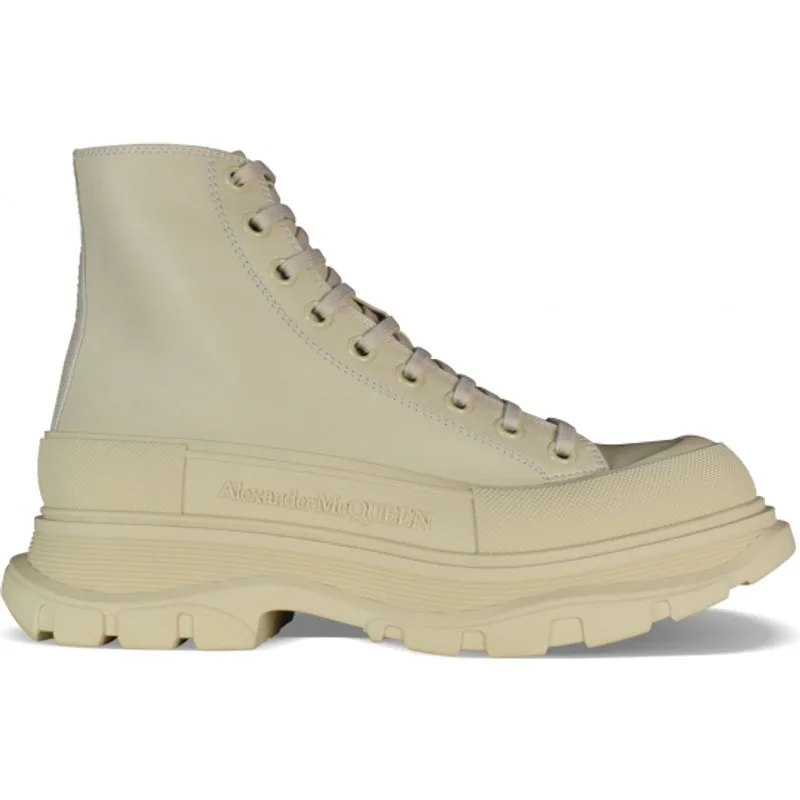 Alexander McQueen Tread Slick hoge sneakers.Beige leer.Ronde neus met rubberen inzet.Logo op hiel en tong.Beige platte vetersluiting.Oversized beige rubberen buitenzool met handtekening.Gemaakt in Italië.