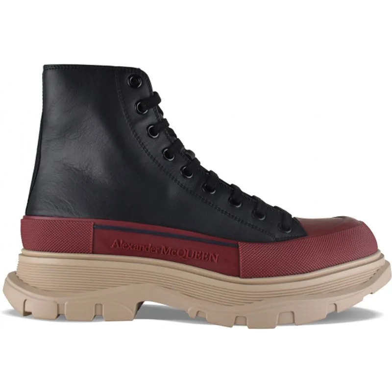 Alexander McQueen Tread Slick hoge sneakers van zwart leer.Bordeauxrood rubberen inzetstuk met logo.Zwarte platte vetersluiting.Ronde neus.Oversized beige rubberen buitenzool.Gemaakt in Italië.