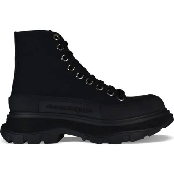 Alexander McQueen Tread Slick hoge sneakers.Zwart canvas.Ronde neus met rubberen inzetstuk.Logo op hiel en tong.Zwarte platte vetersluiting.Oversized zwarte rubberen buitenzool met handtekening.Gemaakt in Italië.
