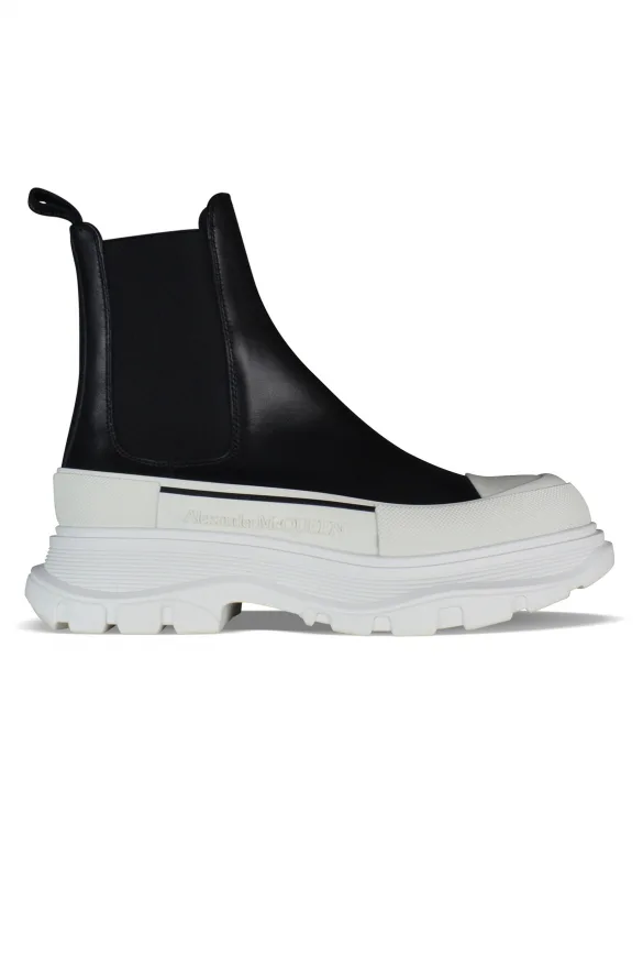 Alexander McQueen Tread Slick-laarzen.Zwart leer.Ronde neus met rubberen inzetstuk.Elastiek aan de zijkant.Treklipje aan de achterkant.Witte oversized rubberen zool met kenmerkend logo.Gemaakt in Italië.