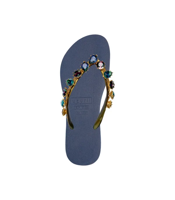 Wist je dat een van de Nederlandse prinsessen Alexia heet? Het verhaal achter dit ontwerp is volledig geïnspireerd op onze Koninklijke familie. Met haar rijk gekleurde stenen, zoals smaragdgroen en koningsblauw, past deze teenslipper perfect in onze kleine Royal collectie. De V wordt bedekt door een gouden kettinkje en is versierd met het originele Uzurii logo over de bandjes.Onze slippers zijn uniek, handgemaakt en met aandacht ontworpen. De zool, die zijdezacht aanvoelt aan je voet, is gemaakt van rubber. De bandjes zijn gemaakt van PVC. De V kenmerkt zich door het originele Uzurii logo op de bandjes. Onze slippers worden gemaakt in China en Brazilië.