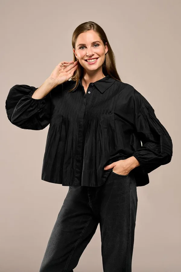Maak kennis met jouw nieuwe favoriet: de Alice Blouse Zwart, een stijlvolle en tijdloze blouse die perfect is voor de lente en zomer. Een klassieke basisblouse met een trendy twist! Deze veelzijdige blouse is gemaakt van 100% katoen, wat zorgt voor een licht, ademend materiaal dat optimaal draagcomfort biedt. De blouse heeft een oversized pasvorm met elegante pofmouwen, wat zorgt voor een moderne en verfijnde uitstraling. Wat deze blouse echt bijzonder maakt, zijn de unieke plooidetails: de verticale plooien aan de voor- en achterzijde en de subtiele horizontale plooien op de mouwen geven de blouse een speelse en interessante twist. De klassieke kraag en blinde knoopsluiting maken deze blouse een tijdloze klassieker. Naast zwart is deze must-have ook beschikbaar in wit, zodat je altijd de perfecte optie hebt die bij jouw stijl past.