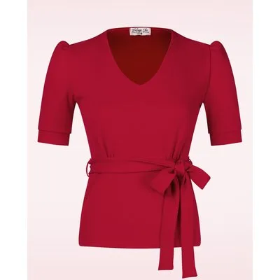 ''A basic with a fun and flirty twist!'' Deze top heeft een elegante V-hals, korte pofmouwtjes en een afneembare strikband in de taille. Uitgevoerd in een stevige maar soepele en crêpe achtige, dieprode stof voorzien van een fijne stretch, waardoor ze een genot is om te dragen. * V-halslijn * Korte pofmouwen * Afneembare strikbanden * Lang genoeg om op een normale heupbroek te dragen