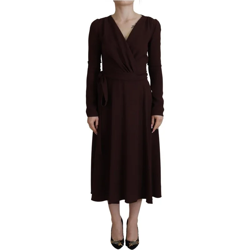 Omarm elegantie, straal vertrouwen uit, trek de aandacht. Deze Dolce & Gabbana wikkeljurk zorgt ervoor dat je een blijvende indruk maakt op elk formeel evenement. Gemaakt van luxueuze crêpe stof, valt hij prachtig voor een flatterende silhouet. De V-halslijn en midi-lengte bieden tijdloze verfijning, terwijl de lange mouwen voor sierlijke bedekking zorgen. Het wikkelontwerp en de striksluiting benadrukken je figuur. De rijke bordeauxrode kleur zorgt ervoor dat je altijd stijlvol gekleed bent. Alleen chemisch reinigen, voor blijvende luxe.