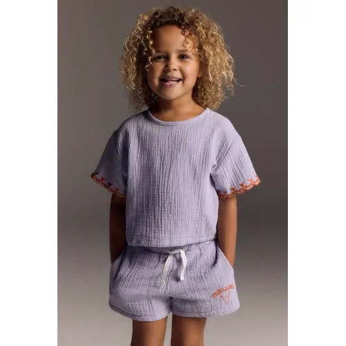Geef haar outfit een ontspannen, maar toch verzorgde look met deze Alix the Label korte broek voor meisjes uit de Alix Mini lijn. De lila sweatshort is gemaakt van 100% katoen en voelt zacht en soepel aan op de huid. Ideaal voor speelmiddagen, een dagje weg of gewoon thuis op de bank.Zachte sweatshort met praktisch design Gemaakt van 100% katoen voor een luchtig en comfortabel gevoel, ook op warmere dagen Elastische tailleband met koord zodat de pasvorm makkelijk aan te passen is Regular waist die net boven de heup valt voor een fijne, alledaagse pasvorm Effen lila kleur die goed te combineren is met T-shirts, tops en sweaters Geen zakken voor een strakke, minimalistische uitstraling Wordt geleverd als enkele short, handig om gericht haar favoriete kleur te kiezenVoor relaxte dagen en actieve momentenDeze sweatshort is gemaakt om zorgeloos in te bewegen. Perfect voor schoolvrije dagen, vakantie of sportieve momenten in de tuin. Combineer met een losvallend T-shirt en sneakers voor een comfortabele everyday look.Alix Mini: stoer en speelsAlix Mini is de kinderlijn van Alix the Label, bekend om eigentijdse modellen en een herkenbare, modische stijl. De ontwerpen zijn afgestemd op kinderen die graag bewegen, zonder in te leveren op een moderne uitstraling.Een zachte, lila basisshort waar zij zich vrij in kan voelen, elke dag opnieuw.