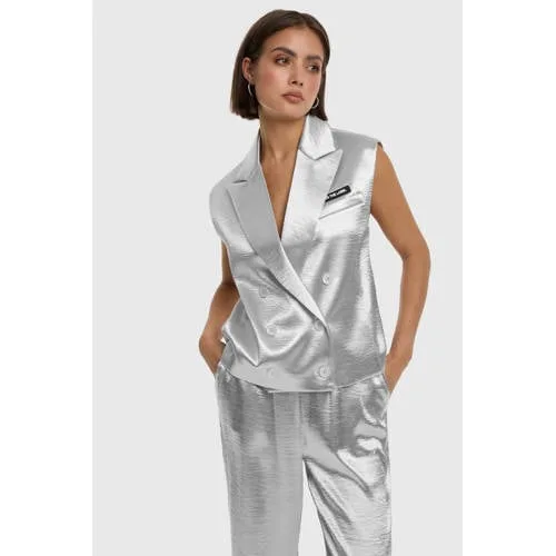 Maak je outfit eenvoudig compleet met het Alix the Label gilet 'Shiny Waistcoat'. Dit mouwloze gilet is een praktische basis voor in je garderobe. De glanzende stof en double breasted knoopsluiting geven een geklede uitstraling, terwijl de rechte snit zorgt voor een strak silhouet dat je het hele jaar door kunt dragen.Details die het verschil maken Mouwloos gilet, ideaal om te layeren over tops, blouses of jurken Double breasted sluiting voor een geklede, licht masculiene look Met reverskraag die mooi valt en je halslijn rustig omlijst Effen design, makkelijk te combineren met prints en basics Sierzakken aan de voorkant voor een verzorgde afwerking Gemaakt van 100% polyester, met een subtiele glans voor een nette uitstralingVan werkdag tot avondplanDit gilet draag je net zo makkelijk naar kantoor als naar een etentje. Over een T-shirt en jeans zorgt het voor een ontspannen, maar verzorgde look. In combinatie met een blouse en een pantalon krijgt je outfit direct een meer geklede uitstraling.Alix the Label: uitgesproken en draagbaarAlix the Label staat bekend om kleding met een eigen karakter, die toch eenvoudig te combineren is. Met dit gilet laat het merk zien hoe je een item maakt dat prettig is in dagelijks gebruik, zodat je met weinig moeite een verzorgde look samenstelt.Een veelzijdig laagje dat elke dag opnieuw makkelijk te combineren is.
