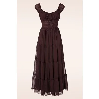 ''The world looks better in a pretty dress!'' Ally heeft cottagecore vibes to the max en is voorzien van korte kapmouwtjes met elastiek die off-shoulder gedragen kunnen worden en het typische aansluitende lijfje met elastisch smock vanwaar ze uitloopt in een flowy midaxi rok. Uitgevoerd in een luchtige, doorschijnende, bordeauxbruine stof en is geheel gevoerd. * Midaxi jurk * Strikbandjes bij de hals * Korte kapmouwtjes met elastiek * Kan off-shoulder gedragen worden * Aansluitend lijfje voorzien van elastisch smock * Geen rits of knopen; aantrekken en ready to go! * Valt bij een lengte van 1,70 m tot net boven de enkel
