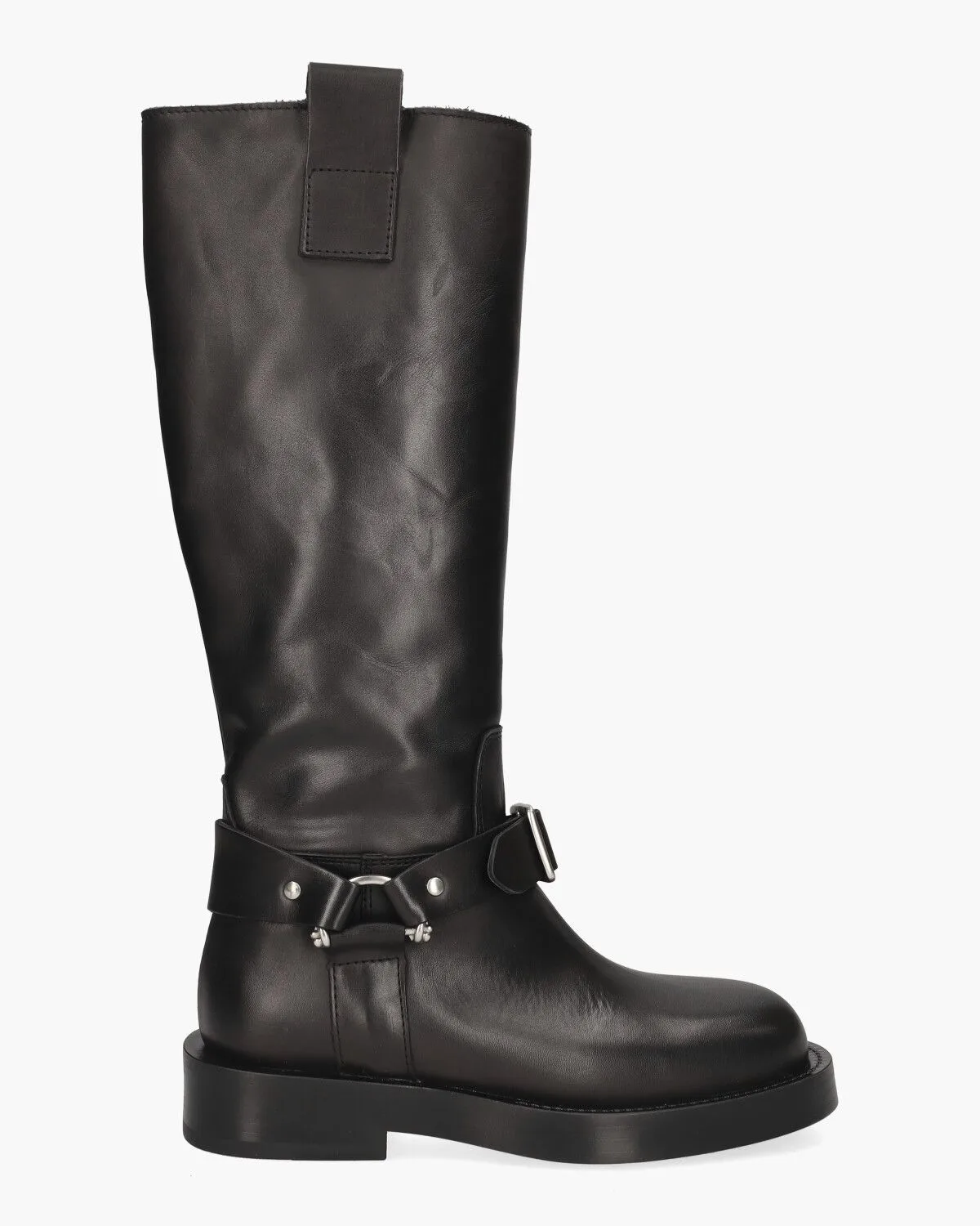De Eloise 5296 lange laarzen voor dames van Alpe hebben een stoer motorstijlontwerp, gemaakt van zwart leer. De binnenkant is van stof gemaakt en is voorzien van een vast voetbed. Met zilverkleurige gespen, ringen en studs krijgen de boots een opvallende uitstraling. De stevige rubberen hak van ongeveer 3 cm versterkt de robuuste look. De
