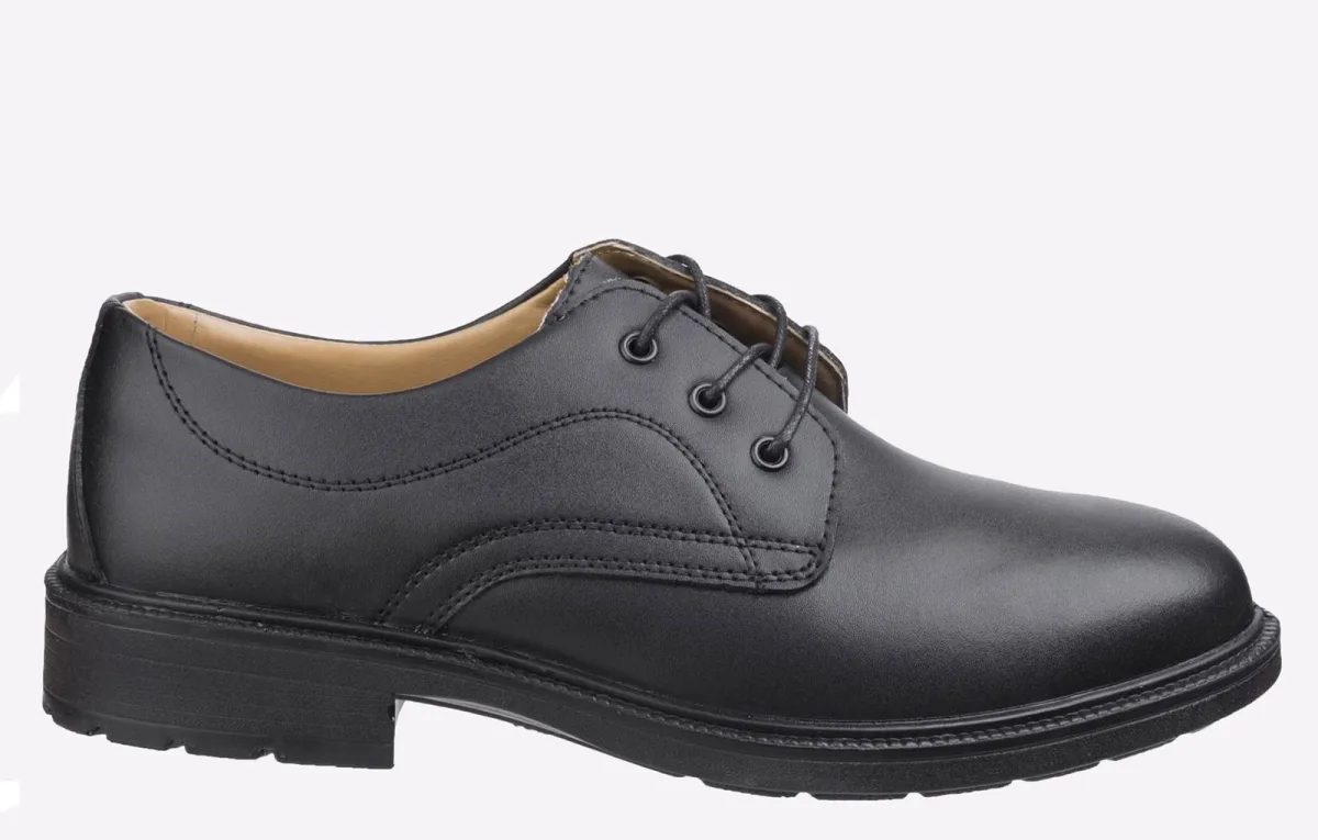 Amblers levert een chique formele leren veiligheidsschoen, ideaal voor industrieel kantoorgebruik en uniform. Stalen neus, niet-metalen penetratiebestendige tussenzool, antistatisch en duurzame PU-buitenzool, dit is een praktische keuze in stijl en veiligheid. - Chique en veilige Gibson ideaal voor industrieel kantoorgebruik en uniformgebruik - Mono-zwart, eenvoudige voorkant schoen vervaardigd met een glad leren bovenwerk - Gemaakt met PU-buitenzool die uitstekende slipweerstand biedt - Vetersluiting aan de voorkant met 3 veterogen - Bescherming met stalen neus tegen impact van 200 joule - Antistatisch - Energieabsorberende hak - Voldoet aan EN ISO 20345:2011 veiligheidsvoorschriften voor schoeisel - Voldoet aan de SRC-slipweerstandsnormen