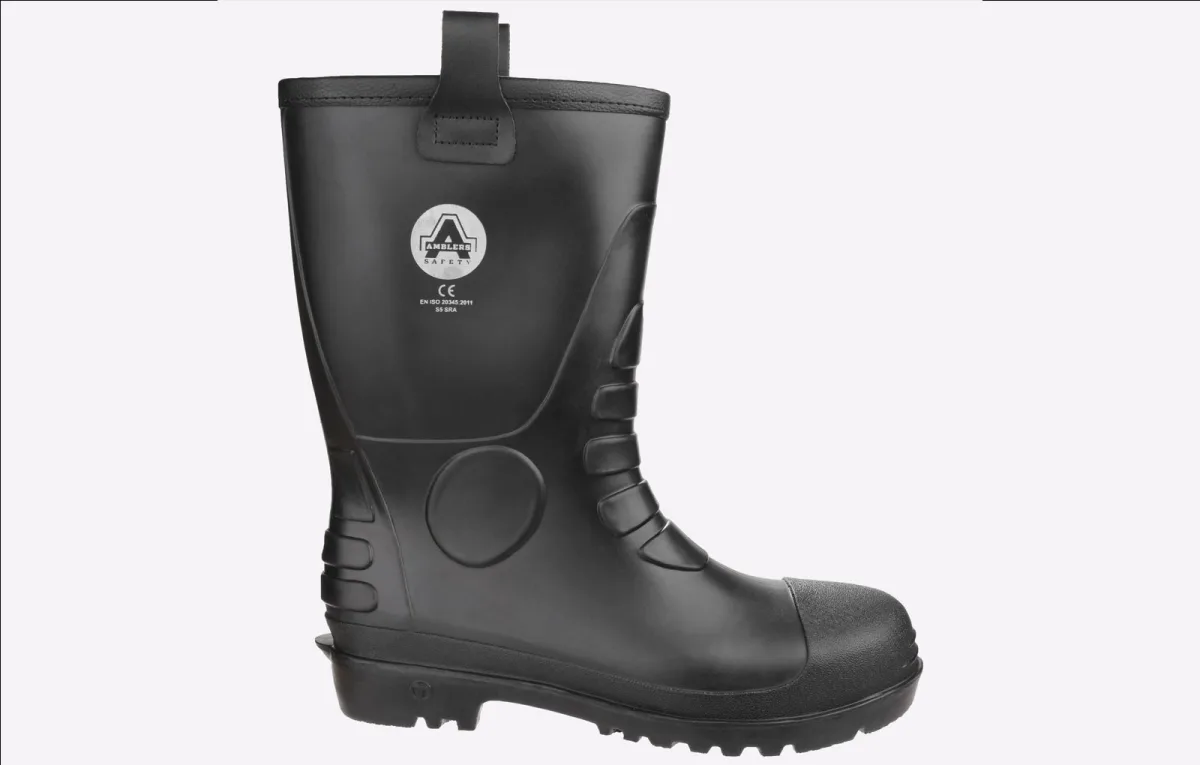 Trek PVC veiligheidsriggerschoenen aan met stalen neus en tussenzool, warme nepbont voering, antistatisch, PVC en nitril rubber buitenzool FS90 Amblers Zwarte Rigger Veiligheidslaars met impact- en compressiebestendige stalen neus - Antistatisch met een energieabsorberende hak - Waterdichte PVC bovenkant - Penetratiebestendige stalen tussenzool - Slipweerstand SRA - Weerstand tegen slippen op keramische oppervlakken bedekt met water en schoonmaakmiddelen - Textielgevoerde laarzen houden je voeten warm terwijl je de hele dag buiten werkt