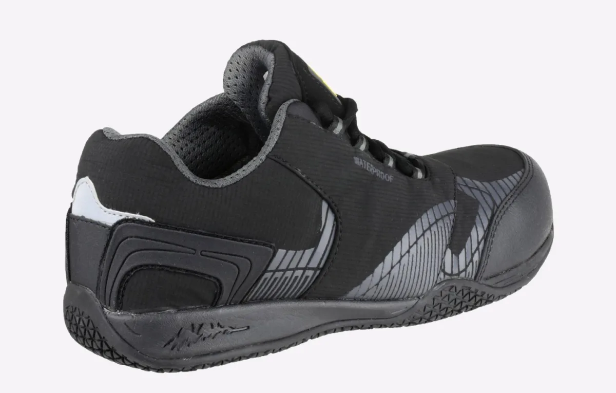 Lichte, niet-lederen metaalvrije trainer met ademend, waterdicht membraan en goede grip dankzij de antislip buitenzool. - Waterafstotend Soft Shell Bovenwerk - Ademend Waterdicht Membraan & Mesh Voering - 200 Joules Fiberglas Composiet Neuskap - Anti-penetratie Niet-Metalen Tussenzool - Verwijderbare PU Schuim Voetbed - Gevormde Rubber Schuurbeschermer - Gevormde Rubber Hakondersteuning - Geveerde Phylon Tussenzool - Gecementeerde Nitril Rubber Buitenzool