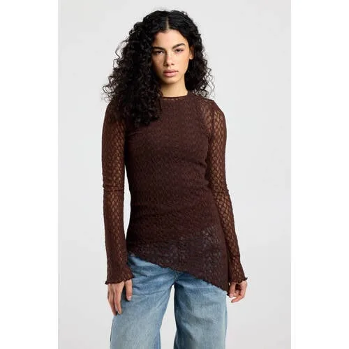 Val op met de America Today Lova longsleeve kant top in donkerbruin. Deze aansluitende top combineert een verfijnd kanten design met speelse details en geeft je outfit een eigentijdse uitstraling. De stof is licht en semi-transparant, waardoor de top zich goed leent voor laagjes.Kant, trompetmouwen en asymmetrische zoom Aansluitende pasvorm die je silhouet volgt Lange trompetmouwen voor een opvallende look Asymmetrische bottom hem die beweging en dynamiek toevoegt Semi-transparant kant dat subtiel huid laat doorschijnen Ronde hals die makkelijk combineert met kettingen of chokers Effen donkerbruine kleur die goed te combineren is Geschikt voor het voorjaar en frisse zomeravondenRebel top voor alledaags en avondDeze kant top uit de Rebel collectie draag je net zo makkelijk overdag als in de avond. Combineer met een bralette of top eronder voor extra bedekking en stijl het met een wijde jeans en sneakers voor een casual dag. Voor een avondlook kies je een high waist rok of pantalon en laarzen. De trompetmouwen en asymmetrische zoom zorgen daarbij steeds voor een opvallend detail.America Today, geïnspireerd op de city lifestyleAmerica Today haalt inspiratie uit het dagelijks leven in de stad. Comfortabele fits, actuele trends en draagbare ontwerpen staan centraal. Met deze Lova top kies je voor een ontwerp met oog voor detail en een moderne stijl.Een kant top die je garderobe aanvult en die je het hele seizoen kunt dragen.