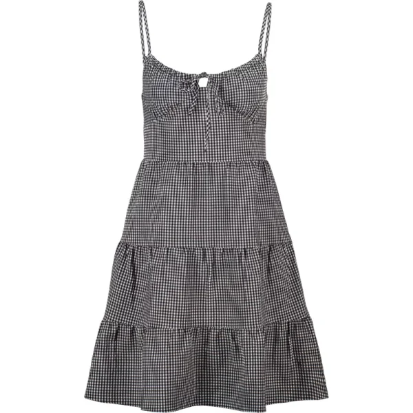 Deze America Today jurk heeft spaghettibandjes en een blinde ritssluiting. De jurk is kort en gemaakt van polyester, met een vierkante hals, verstelbare bandjes, strikje en volant.