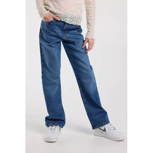 Deze America Today Michigan Jr jeans is gemaakt voor meiden die houden van een relaxte pasvorm met een stoere uitstraling. De donkerblauwe denimkleur is makkelijk te combineren met T-shirts, truien en blouses, terwijl de loose fit en hoge taille zorgen voor een comfortabele en moderne look. De opvallende studs bij de zakken en langs de zijnaden geven de broek net dat extra karakter, zonder dat het te druk wordt.Losse fit met stoere details Loose fit model voor een ontspannen en comfortabele pasvorm Hoge taille voor een moderne look en extra draagcomfort Stoere studs bij de voorzakken, langs de zijnaden en op de achterzakken Donkerblauwe denimkleur die makkelijk te stylen is Gemaakt van 100% katoen voor een stevige, draagbare jeans Praktische vijf-pocket uitvoering met rits- en knoopsluiting Effen ontwerp waardoor de studs extra goed opvallenDagje school of weekend, deze jeans kan altijdVoor naar school met sneakers en een basic T-shirt, of in het weekend met een hoodie of gilet, deze jeans past zich moeiteloos aan. De loose fit geeft voldoende bewegingsvrijheid, waardoor spelen, fietsen en chillen net zo makkelijk gaat als er goed uitzien.America Today, geïnspireerd op casual city styleAmerica Today staat bekend om kleding met een ontspannen, stads geïnspireerde stijl. De collecties zijn gemaakt voor dagelijks gebruik, met aandacht voor pasvorm, materialen en details zoals de studs op deze jeans. Zo haal je een broek in huis met een verzorgde uitstraling, die tegelijk klaar is voor het dagelijkse leven.Een stoere basisjeans voor elke dag.