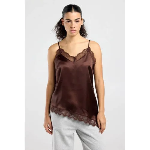 Val op met de America Today Indie camisole, een top met een speelse twist. De asymmetrische halslijn in combinatie met het verfijnde kant geeft deze bruine camisole een moderne uitstraling. De gladde, glanzende stof voelt soepel aan op de huid en valt recht langs het lichaam, waardoor de top mooi om je figuur heen valt zonder strak te zitten.Verfijnde details voor een opvallende look Asymmetrisch design voor een moderne, speelse uitstraling Kanten inzet aan de bovenzijde voor een fijne, subtiele afwerking V-hals die het decolleté subtiel accentueert Dunne spaghettibandjes voor een luchtig en zomers gevoel Rechtvallend model dat soepel langs je lichaam valt Glimmende satijnlook met een rustige, glanzende finish Effen bruine kleur die goed te combineren is met andere itemsStylen van de asymmetrische Indie topDe Indie top leent zich goed voor zowel dagelijkse outfits als avondlooks. Combineer met een hoge jeans en sneakers voor een casual dag, of draag de top op een zwarte pantalon met hakken voor een avond uit. Een blazer erover maakt het geheel net iets gekleder.America Today, everyday styleAmerica Today staat bekend om eigentijdse kleding met een relaxte, stedelijke stijl. De collecties zijn geïnspireerd op het dagelijkse leven, met items die je makkelijk combineert en vaak draagt. Met de Indie camisole voeg je een praktische top toe aan je garderobe die je op verschillende manieren kunt stylen.Een glanzende basic die je outfit op een eenvoudige manier een extra accent geeft.