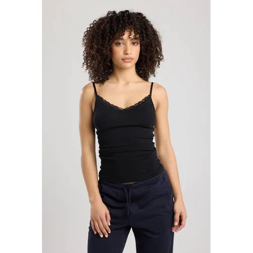 Deze singlet van America Today voor dames heeft een aansluitende pasvorm. Het is gemaakt van katoen en heeft verstelbare bandjes en kantdetails. De singlet heeft spaghettibandjes en een V-hals zonder sluiting.