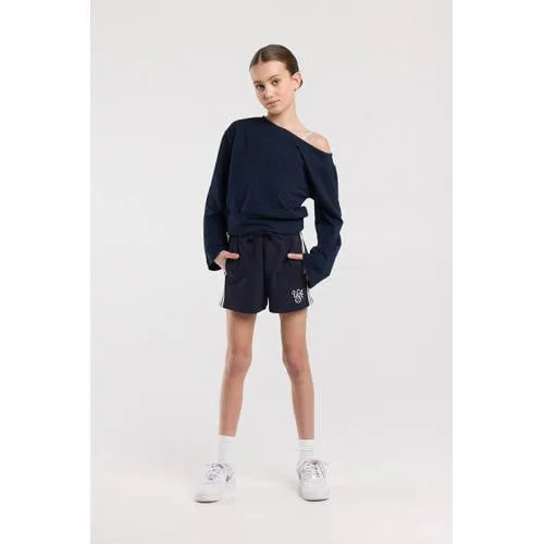 Voor een ontspannen en sportieve look is de America Today Neomie Jr short een fijne basic in de kast. De donkerblauwe sweatshort heeft een elastische tailleband in zwart met witte streepjes, wat meteen voor een opvallend accent zorgt. Het subtiele 'USA'-borduursel op het rechterbeen geeft de korte broek een herkenbare America Today uitstraling.Sportieve details en comfortabel materiaal Gemaakt van 80% katoen en 20% polyester voor een zachte, soepele feel Elastische tailleband met koord voor een aansluitende pasvorm rond de heupen Zwart elastiek met witte streepjes als sportief detail 'USA'-borduursel op het rechterbeen voor een herkenbare look Contrast bies langs de zijkant voor een speelse, dynamische lijn Effen donkerblauwe kleur, makkelijk te combineren met T-shirts en tops Casual sweatshort zonder zakken, ideaal voor ontspannen momentenVoor relaxte dagen en actieve momentenDeze meisjes short is ideaal voor vrije tijd, een dagje thuis of buitenspelen. De zachte sweatstof voelt prettig aan op de huid en biedt genoeg bewegingsvrijheid om te rennen, springen en sporten. Door de elastische taille met koord blijft de broek goed op de plek, ook tijdens actief gebruik.America Today, geïnspireerd door de campusstijlAmerica Today haalt inspiratie uit de Amerikaanse college- en campusstijl, met comfortabele items die makkelijk te dragen zijn. De collecties zijn gericht op dagelijkse outfits die goed passen bij een actieve levensstijl. Met deze short kies je voor een item dat past binnen die ontspannen, sportieve stijl.Een sportieve basic waar je kind zich de hele dag vrij in kan bewegen.