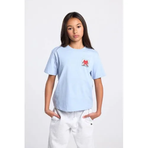 Dit America Today Edda JR T shirt meisjes lichtblauw brengt het typische Keith Haring ontwerp naar de garderobe. Op zowel de voorkant als de achterkant staat het karakteristieke beeld van dansende figuren die een hart vasthouden. De zachte lichtblauwe kleur vormt een rustige basis voor het grafische artwork en maakt het shirt geschikt voor alledaagse momenten.Grafische details met comfortabele pasvorm Shirt met Keith Haring print op voor en achterkant Dansende figuren met hart voor een duidelijk grafisch effect Korte rechte mouwen voor luchtig draagcomfort Ronde hals die mooi aansluit bij de nek Gemaakt van 100 procent katoen voor een zachte touch Lichtblauwe kleur die makkelijk combineert met andere kleding Speciaal ontworpen voor meisjes Verpakking met 1 stukElke dag eenvoudig te stylenDit shirt past goed bij relaxte dagen thuis, naar school of een uitstapje in het weekend. De print op zowel de voor als achterkant zorgt voor een extra detail, ook wanneer er een vest of open overhemd overheen wordt gedragen.America Today als vertrouwde basisAmerica Today biedt eigentijdse kleding met herkenbare invloeden uit de Amerikaanse casual stijl. Het merk richt zich op comfortabele pasvormen en praktische basics met grafische prints. Zo ontstaat kleding die eenvoudig te combineren is en geschikt is voor dagelijks gebruik.Een shirt dat elke dag het grafische ontwerp subtiel laat terugkomen in de outfit.