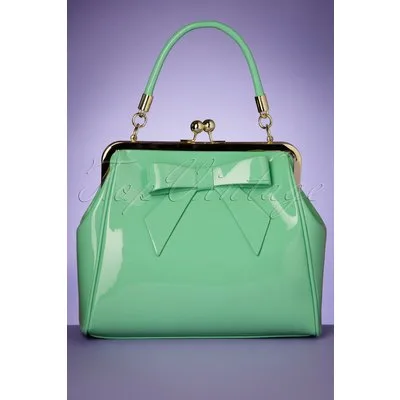Mensen die tegen je zeggen: ''Je hebt toch al genoeg tassen?'' Daar moet je gewoon 'lak' aan hebben terwijl je deze 50s American Vintage Patent Bag in Mint Green in je winkelmandje klikt! Ze hebben dan misschien wel gelijk, maar zo een als deze had je vast nog niet ;-) Deze beauty heeft een opvallende goudkleurige metalen klipsluiting voor een echte vintage look. Uitgevoerd in mintgroen 'faux' lakleder afgewerkt met een schattige strik. Ze wordt bovendien geleverd met een los, verstelbaar hengsel zodat je haar ook speels om je schouder kunt hangen. ''Just... can't... resist!'' * Medium sized * Klipsluiting * Binnenvak met 3 extra vakjes, waarvan 1 met rits * Afneembaar hengsel * Kan crossbody gedragen worden * Volledig gevoerd * Groot genoeg voor je telefoon, sleutels, en portemonnee