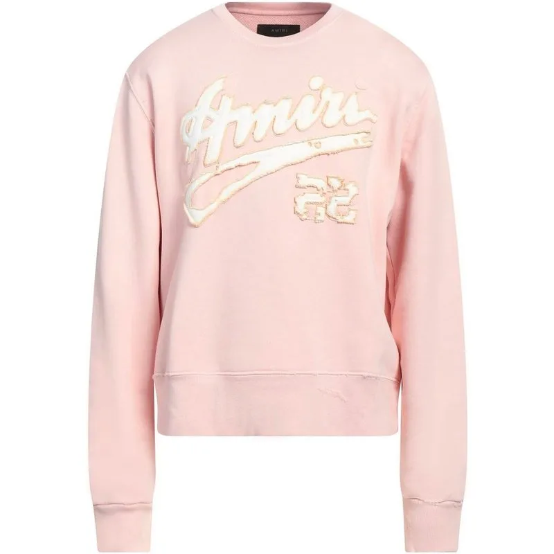 Roze Amiri-sweatshirt, normale pasvorm, maat valt normaal, 100% katoen, gemaakt in de VS, geribbelde mouw- en taille-uiteinden, wit logo, roze trui, streetwear