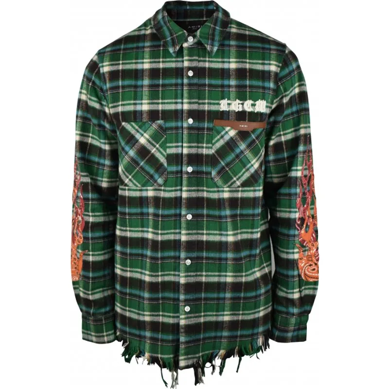 Amiri groen en blauw geruit katoenen overshirt.Rode en oranje bandana-prints op de mouwen.Oranje logo gedrukt op de achterkant.Geborduurde witte letters op de achterkant.Zijzakken op de borst.Bruin leren logo-juk bovenop één zak.Pony aan de onderkant.Knoopsluiting.Klassieke kraag.