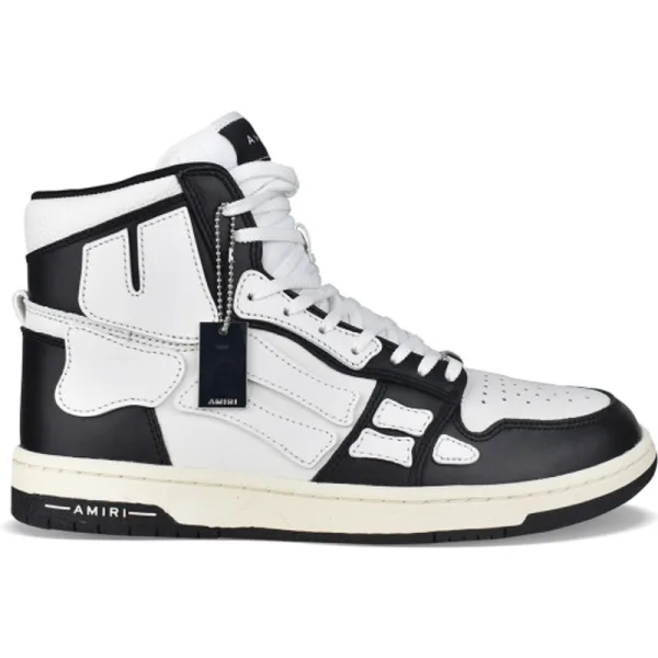 Skel Top Amiri hoge sneakers van zwart en wit leer.Witte lederen inzetstukken die een skelet vormen.Witte nylon tong met logo.Metalen logoplaat aan de voorkant.Zwart-witte dunne rubberen zool met logo.Witte veters.Ronde neus.